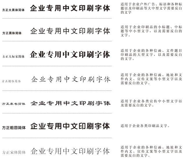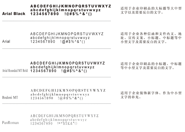 為使視覺形象更加統(tǒng)一,所有傳媒所用文字,均應(yīng)選用以下規(guī)定字體。字體允許向右傾斜20度,允許長(zhǎng)體90%―100%,扁體110%-120%。禁止使用其他字體,特性情況(如節(jié)日、慶典)設(shè)計(jì)例外。同時(shí),為求得運(yùn)用方便,在刊物,媒體及封面的排版上,若無相同字體時(shí),可選擇字形相近的字體替代使用。