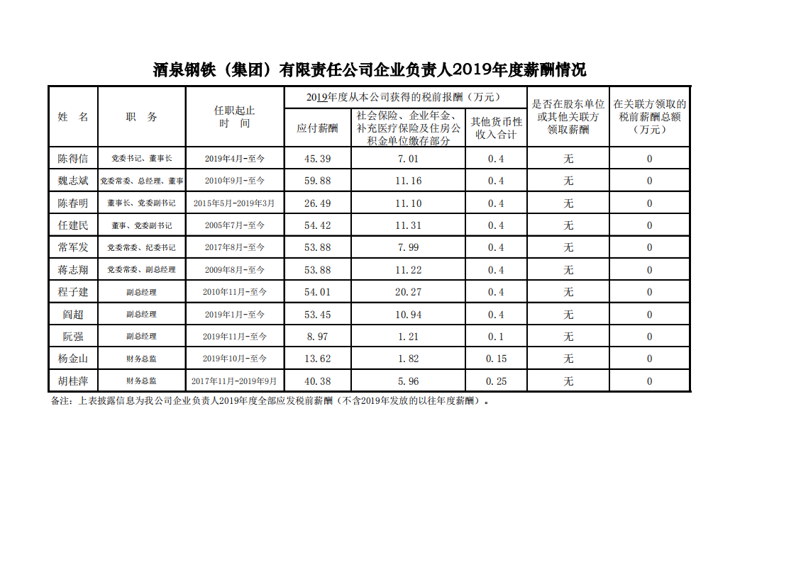 酒泉鋼鐵(集團(tuán))有限責(zé)任公司企業(yè)負(fù)責(zé)人2019年度薪酬情況