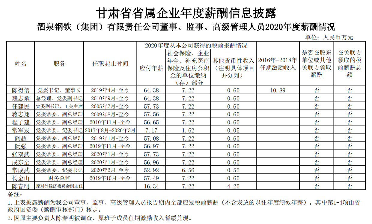 酒泉鋼鐵(集團(tuán))有限責(zé)任公司董事、監(jiān)事、高級管理人員2020年度薪酬情況