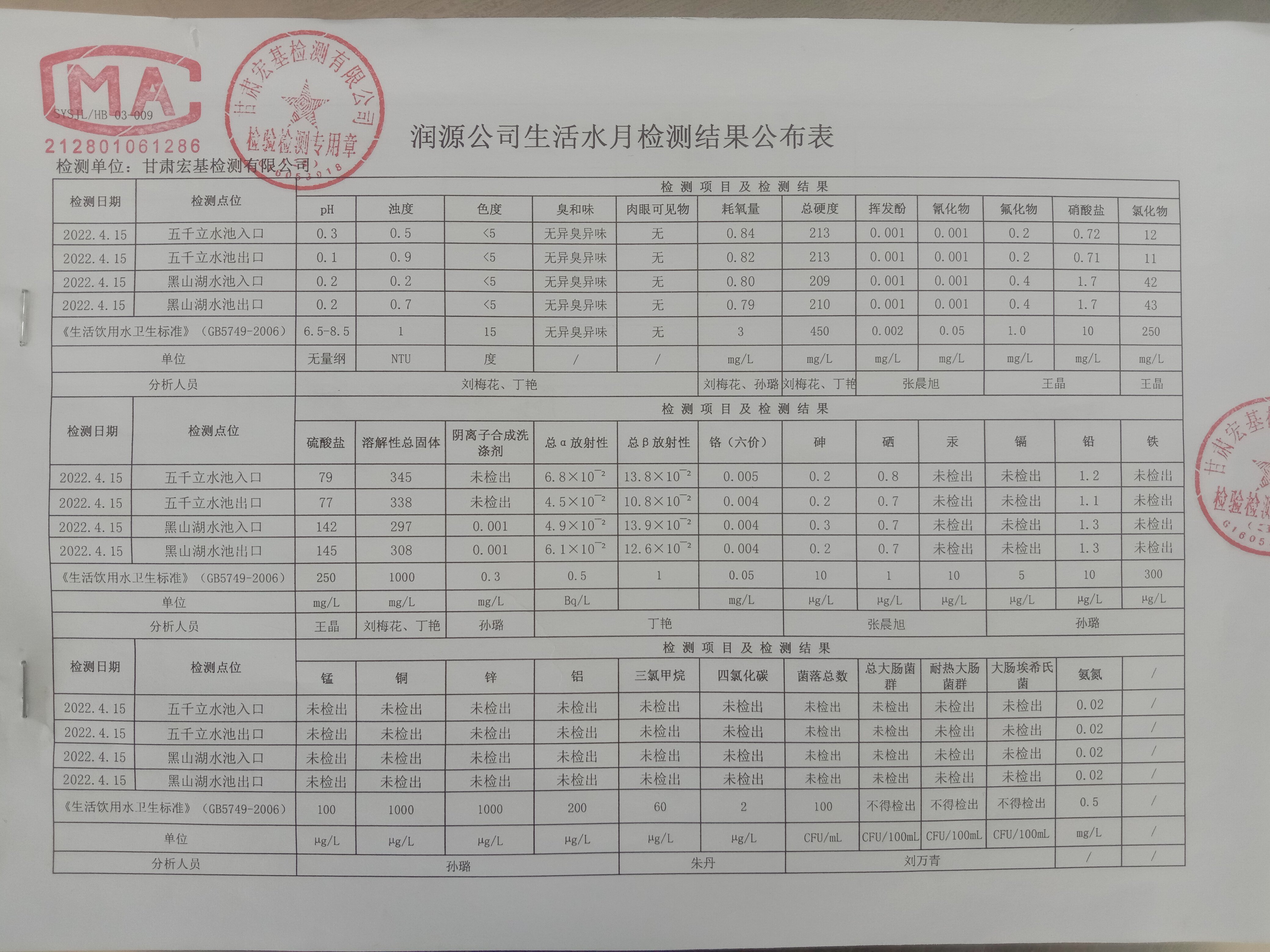 甘肅潤源環(huán)境資源科技有限公司水源地水質二季度公示