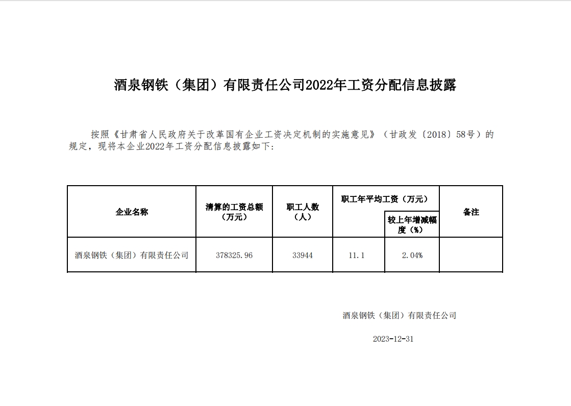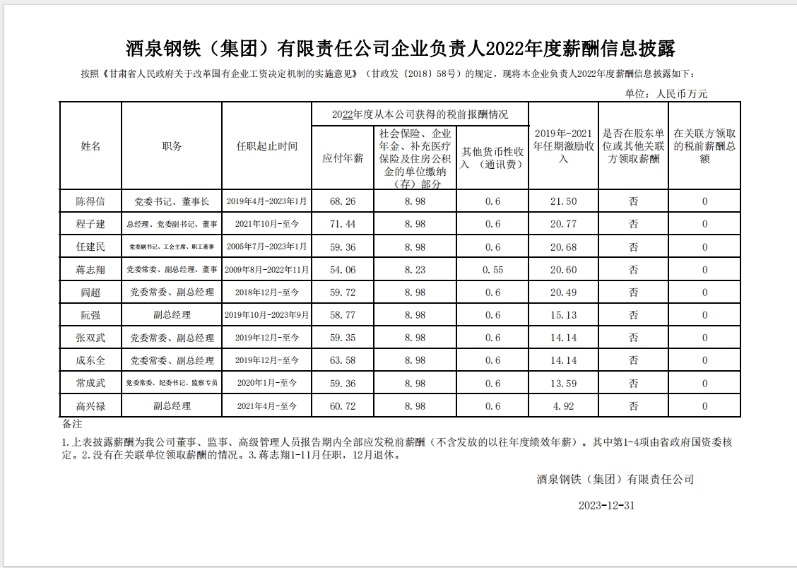 酒泉鋼鐵(集團(tuán))有限責(zé)任公司2022年工資分配及企業(yè)負(fù)責(zé)人2022年度薪酬信息披露