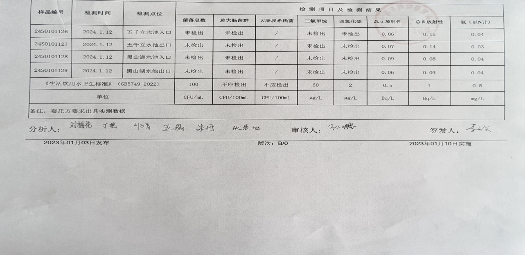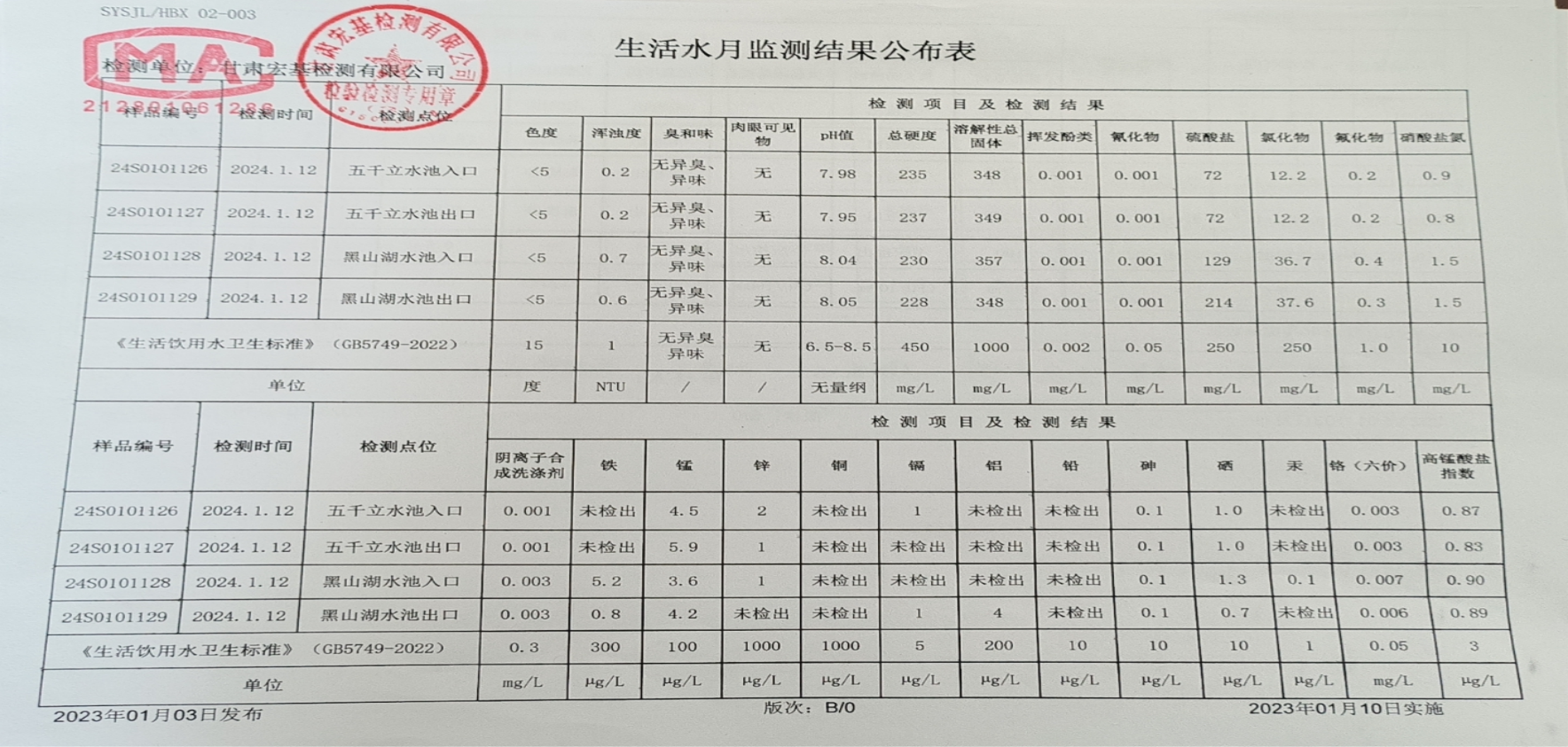 甘肅潤源環(huán)境資源科技有限公司水源地水質(zhì)2024年第一季度公示